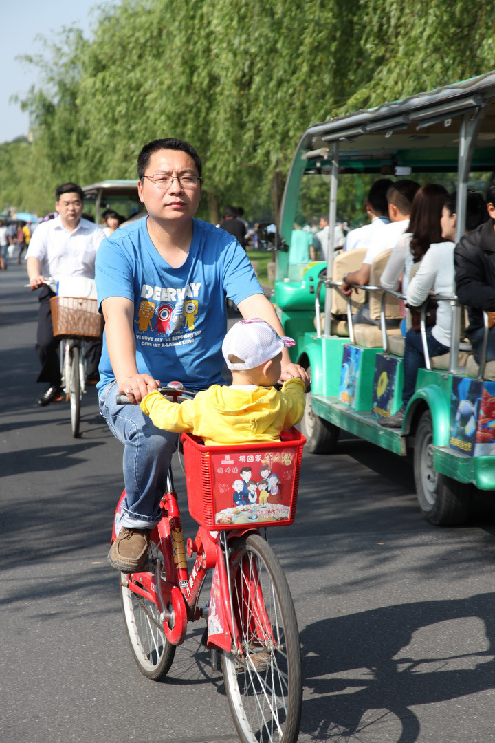 5月12日,在白堤,見(jiàn)一位男士,將其小孩放在自行車兜里,在騎行。萬(wàn)一出事,后果嚴(yán)重。安全切記切記!