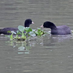 西溪濕地一對白骨頂雞啄食水葫蘆