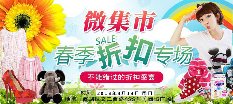 號外!號外! 19樓線下微集市【春季折扣專場】將會在2013年4月14日(周日) 9點-16點 在西城廣場舉辦。