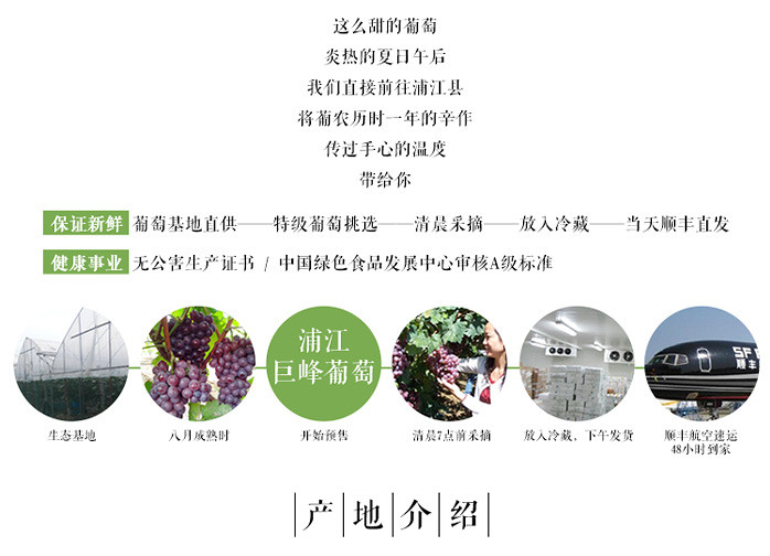 浦江,巨峰葡萄之鄉(xiāng)——江南的吐魯番造就香甜特級葡萄,色黑紫,味甜、汁多、果粉多~2500g足量葡萄,粒大飽滿,晶瑩剔透,還不趕快帶回家~~自提時間:31號,1號,5號 每天10:30-15:30~~29日—30日下午17點前的訂單,31號提貨;30日17點—31號17點前的訂單,1號提貨;31日下午17點—8月4日下午16點前的訂單,5號提貨