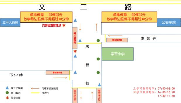 三、文二路由西向東的一條機(jī)動車道為臨時停車區(qū)域。臨時停車時段上午為 7:40- 8:00;下午為 16:00 -16:20,17:30 -17: 50。早上時段即停即走,放學(xué)臨停不得超過10分鐘,不允許停兩排車或者在第二排車道上下車,違規(guī)車輛交警部門將予以處罰。
