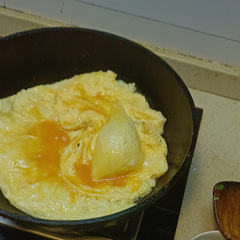油鍋,炒蛋。再放適量冷飯。炒散,加入鹽,及之前的熟胡蘿卜辣椒韭菜末,加適量本豬肉豬油,增加口感和香味,撒適量生抽翻炒均勻,加入蔥,翻炒幾下后出鍋。