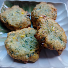 豆腐魚打成魚泥加入鹽,料酒,白胡椒粉,紫蘇葉,玉米粒熱水過一下?lián)瞥隼渌^涼然后放在魚泥里,起油鍋炸一下就變成一道美味