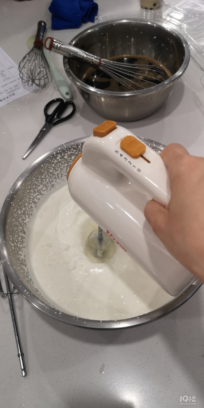 5.稀奶油打發(fā)至六成(有點(diǎn)粘稠)加入4中拌勻