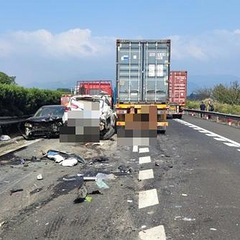 十秒鐘后,一輛集裝箱撞了上來(lái),最后一輛事故小白車(chē)被撞得旋轉(zhuǎn)了180度,小白車(chē)車(chē)身也猛烈地撞擊了好幾下。