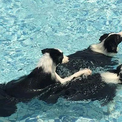 邊牧游泳游累了,偷懶把手搭在了哥哥的背上...還得是你啊
