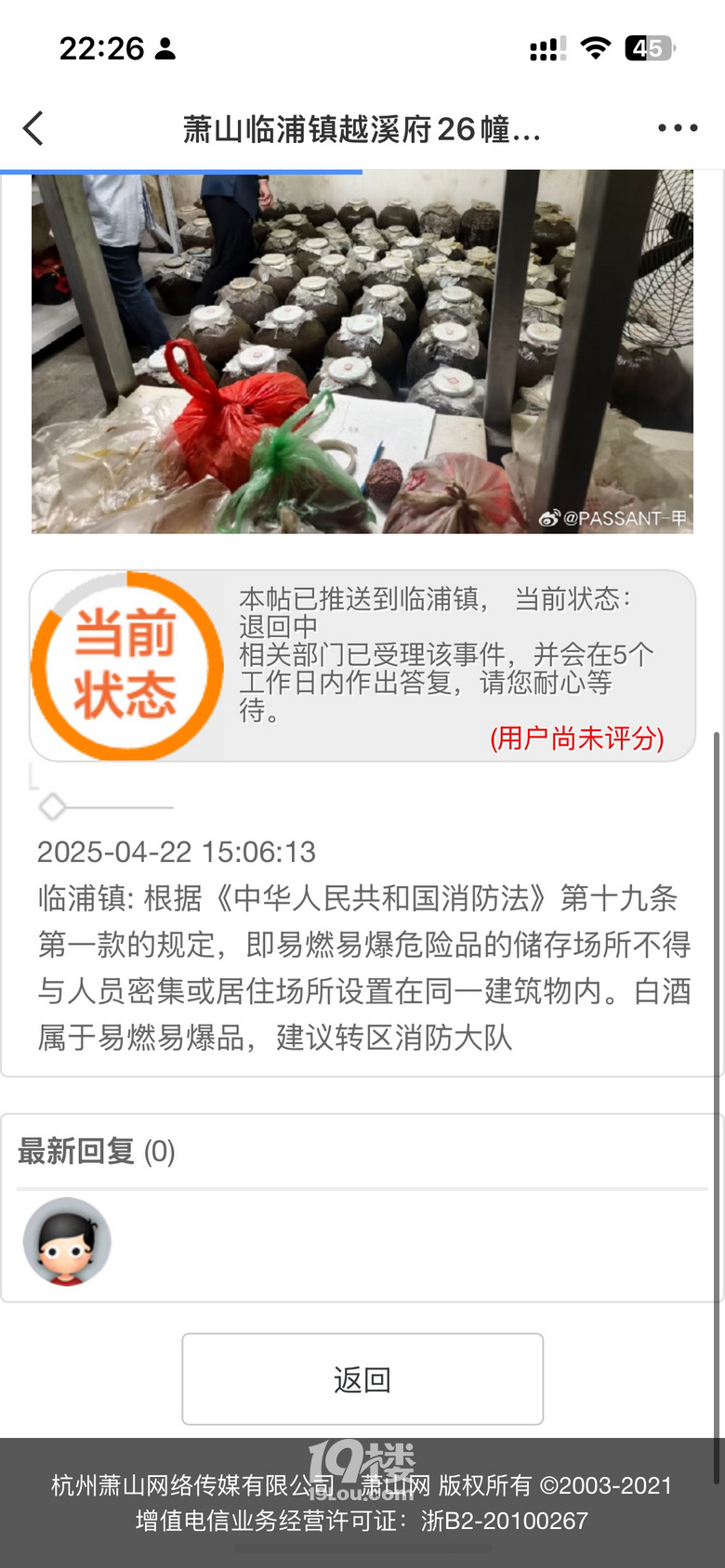 第二天早上,26幢業(yè)主給消防、派出所、市場(chǎng)監(jiān)督管理局、城建打了電話。因?yàn)椴簧婕敖灰,市?chǎng)監(jiān)督管理局說他們無法受理;派出所幫助業(yè)主破門而入,確實(shí)在現(xiàn)場(chǎng)發(fā)現(xiàn)了大量白酒,都拍照記錄了;城建工作人員過來檢查后確定存放白酒的房間屬于違章建筑,他們可以隨時(shí)拆掉,但需要消防過來處理完之后他們?cè)賮聿;消防則說需要三天之內(nèi)過來處理。