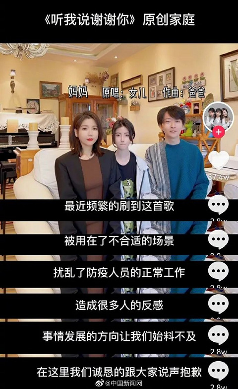 “聽我說謝謝你,因為有你,溫暖了四季!”你最近有沒有被這段旋律和歌詞洗腦?最近,這首歌曾多次出現(xiàn)在核酸檢測現(xiàn)場,有人在完成檢測后用它對醫(yī)護人員表演,引發(fā)網(wǎng)友爭議。 近日,《聽我說謝謝你》原唱李昕融一家三口,首次就這首歌曲近期的出圈作出道歉和回應(yīng)。 原唱家庭道歉,懇請大家“適時使用” 李昕融父親表示,這首歌創(chuàng)作于2019年,初衷是讓孩子懂得感恩,卻沒想到被用在不合適的場景,擾亂了防疫人員正常工作