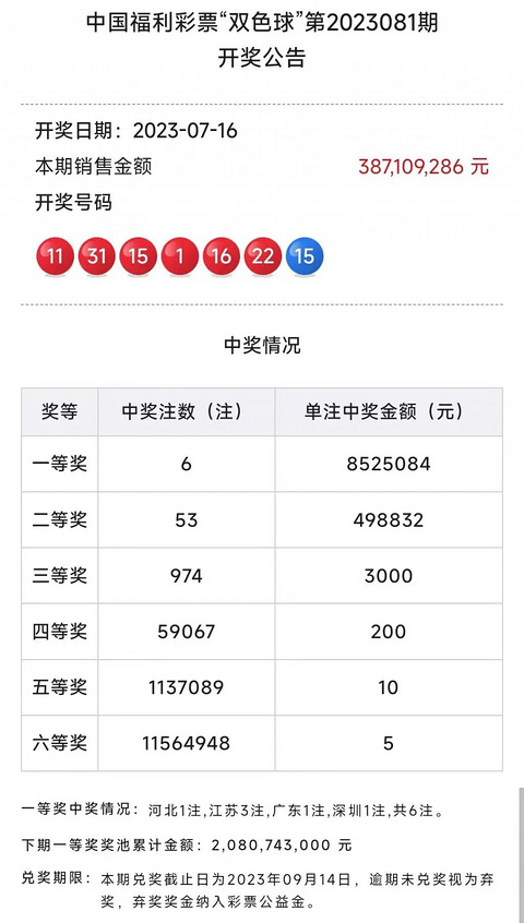 7月16日晚,中國福利彩票雙色球游戲進行第2023081期開獎。當(dāng)期全國共中頭獎6注,其中3注花落蘇州,中出一等獎2557萬余元,這也是蘇州今年最大的雙色球大獎。 根據(jù)系統(tǒng)檢索,這張中獎彩票售出于蘇州張家港市楊舍鎮(zhèn)的一處福彩投注站。出票時間為2023年7月14日18點21分32秒,是一張機選18元的單式彩票,9注號碼采用“三三得九”式投注,即1注號碼3倍倍投,該種投注方式較為獨特,其中第二注倍投號