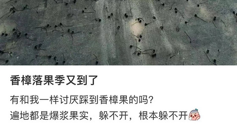 每年一到這個季節(jié)馬路上就會落滿黑色果子行人走過踩上去“噗噗噗”在地上留下一個個小黑點 經(jīng)常會突然一顆掉在頭上嚇你一跳停在樹下的車輛被“涂鴉”汁液粘在地上留下了深淺不一的污漬 出門的朋友也要小心盡量不要穿著淺色衣服避免在路過樹下的時候收到這些“黑珍珠”問候 不少網(wǎng)友吐槽: 躲不開,根本躲不開 這到底是什么? 這些“黑珍珠”是不是很眼熟呢它就是香樟樹的果實這個季節(jié)是香樟樹果實成熟后的自然掉落期 香樟樹